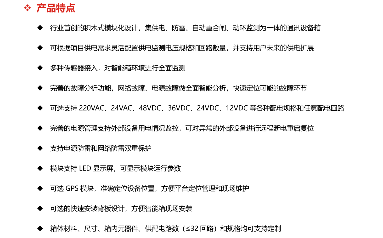 SCU3000M 智能通信配電箱(以下簡稱:智能箱)集智能管理控制單元、環(huán)境檢測單元、多規(guī)格配電監(jiān)測管理單元和多規(guī)格交直流供電單元于一體,行業(yè)首創(chuàng)積木式全模組化設計,靈活應對和滿足用戶不同項目和不同點位對供電規(guī)格和回路的需求,并支持用戶未來供電增加的升級需求。