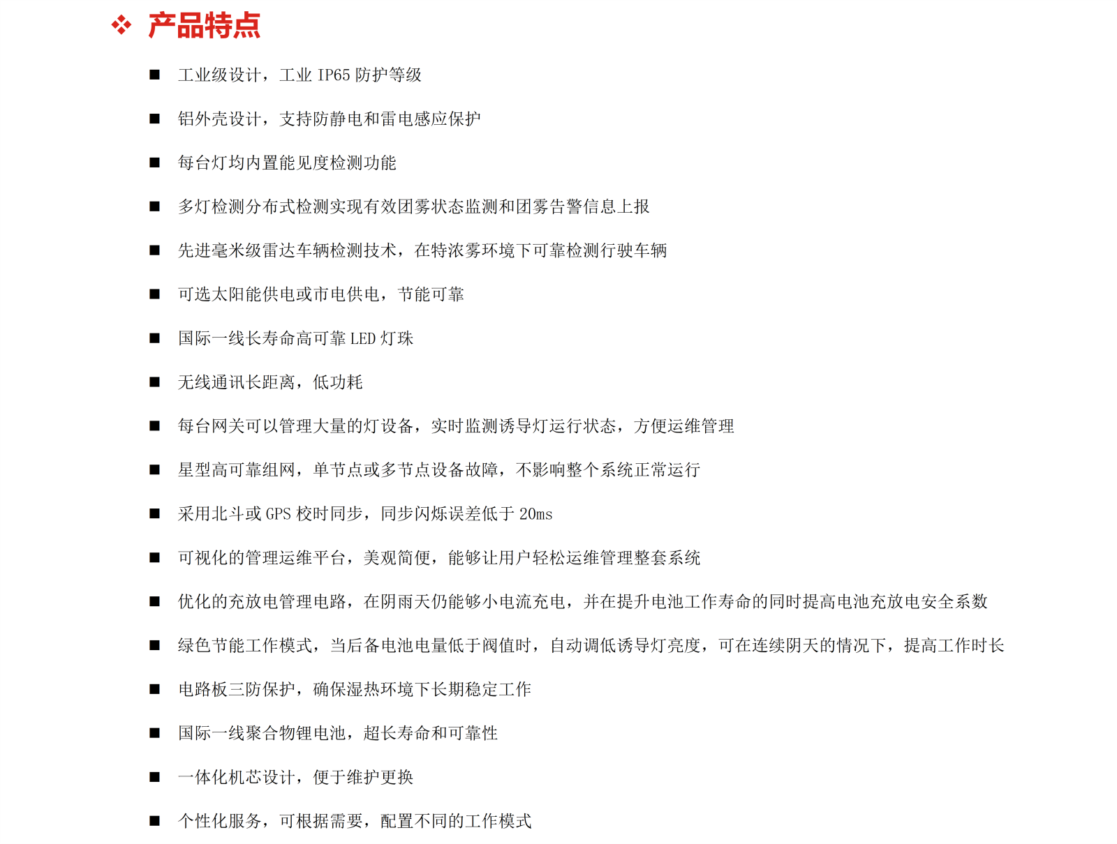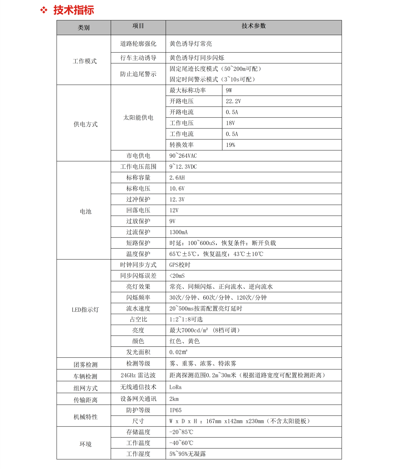 該系統(tǒng)基于IoT技術(shù),利用成熟的LoRa協(xié)議進(jìn)行數(shù)據(jù)交互。每臺(tái)霧燈均內(nèi)置的能見度檢測(cè)、溫濕度檢測(cè)以及雷達(dá)波車輛檢測(cè)功能,支持市電供電或太陽能供電,節(jié)能可靠,能夠適應(yīng)各種復(fù)雜的應(yīng)用環(huán)境。