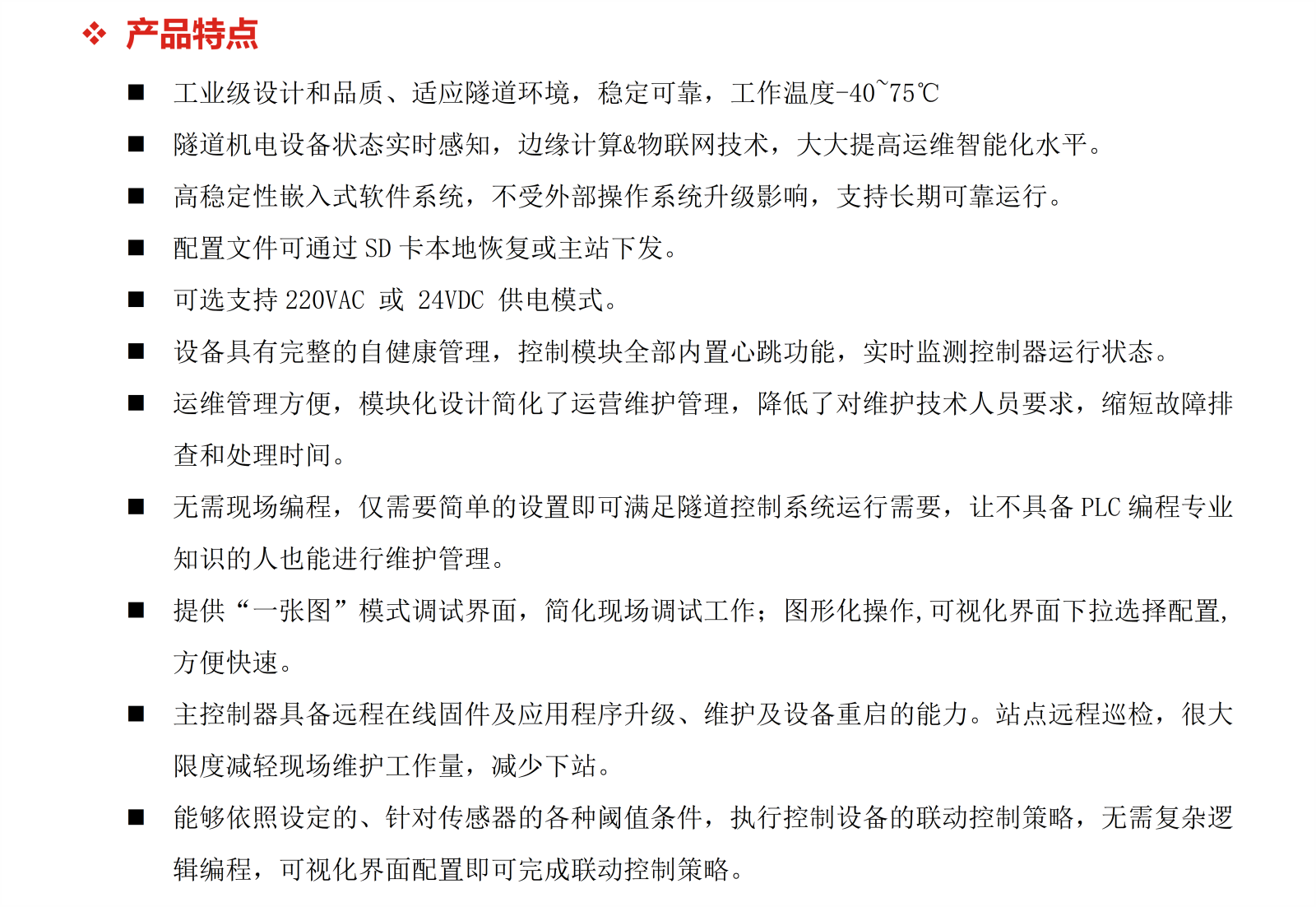 分布式智能物聯(lián)控制器負(fù)責(zé)采集隧道現(xiàn)場區(qū)域范圍內(nèi)設(shè)備的狀態(tài)信息,同時將主控制器下發(fā)的指令轉(zhuǎn)發(fā)到設(shè)備執(zhí)行,安裝在隧道內(nèi)。支持通過串口、網(wǎng)絡(luò)、I/O等多種方式接入設(shè)備,無需編程即可支持用戶自定義生成接入設(shè)備的種類和接口通訊。