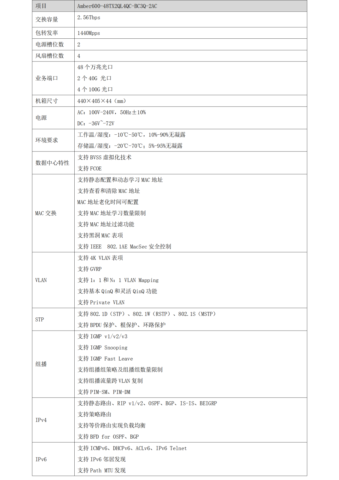 v Amber600-48TX2QL4QC-BC3Q-2AC支持STP/RSTP/MSTP協(xié)議,支持VRRP協(xié)議,同時支持環(huán)網(wǎng)保護,雙上行主備鏈路保護,LACP鏈路聚合等簡單高效的冗余保護機制。