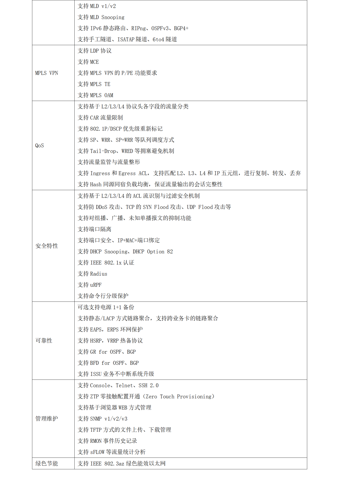 v 支持MLD、MLD Snooping等IPv6組播特性,支持IPv6靜態(tài)路由、RIPng、OSPFv3、BGP4+等IPv6三層路由協(xié)議,為用戶提供完善的IPv6二、三層解決方案。