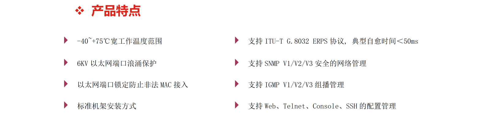 工業(yè)IP40防護(hù)等級(jí)的金屬機(jī)殼、堅(jiān)固的1U機(jī)架結(jié)構(gòu)、高達(dá)6KV的以太網(wǎng)端口浪涌保護(hù)等設(shè)計(jì)為交換機(jī)在惡劣的工作環(huán)境中穩(wěn)定運(yùn)行提供了可靠保障。