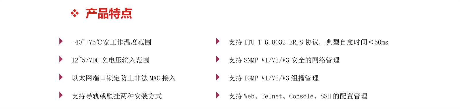 工業(yè)IP40防護(hù)等級(jí)的金屬機(jī)殼、抗強(qiáng)振卡軌結(jié)構(gòu)、MTBF≥300000h、高達(dá)6KV的以太網(wǎng)端口浪涌保護(hù)等設(shè)計(jì)為交換機(jī)在惡劣的工作環(huán)境中穩(wěn)定運(yùn)行提供了可靠保障。