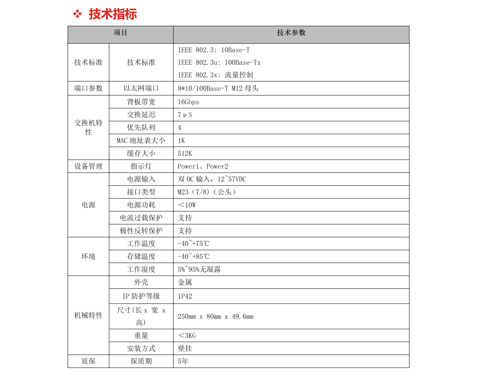 產(chǎn)品符合EN50155和EN50121行業(yè)標(biāo)準(zhǔn)要求,工業(yè)級(jí)設(shè)計(jì)采用IP42防護(hù)等級(jí)的金屬機(jī)殼、MTBF≥300000h、高達(dá)6KV的以太網(wǎng)端口浪涌保護(hù)等設(shè)計(jì)為交換機(jī)在惡劣的工作環(huán)境中穩(wěn)定運(yùn)行提供了可靠保障。