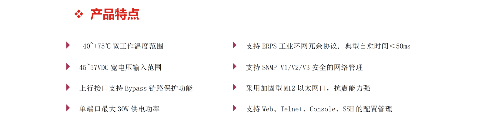 產(chǎn)品符合EN50155和EN50121行業(yè)標準要求,支持IEEE802.3af/at以太網(wǎng)供電協(xié)議標準。工業(yè)級設計,采用IP42防護等級的金屬機殼、MTBF≥300000h、高達6KV的以太網(wǎng)端口浪涌保護等設計為交換機在惡劣的工作環(huán)境中穩(wěn)定運行提供了可靠保障。